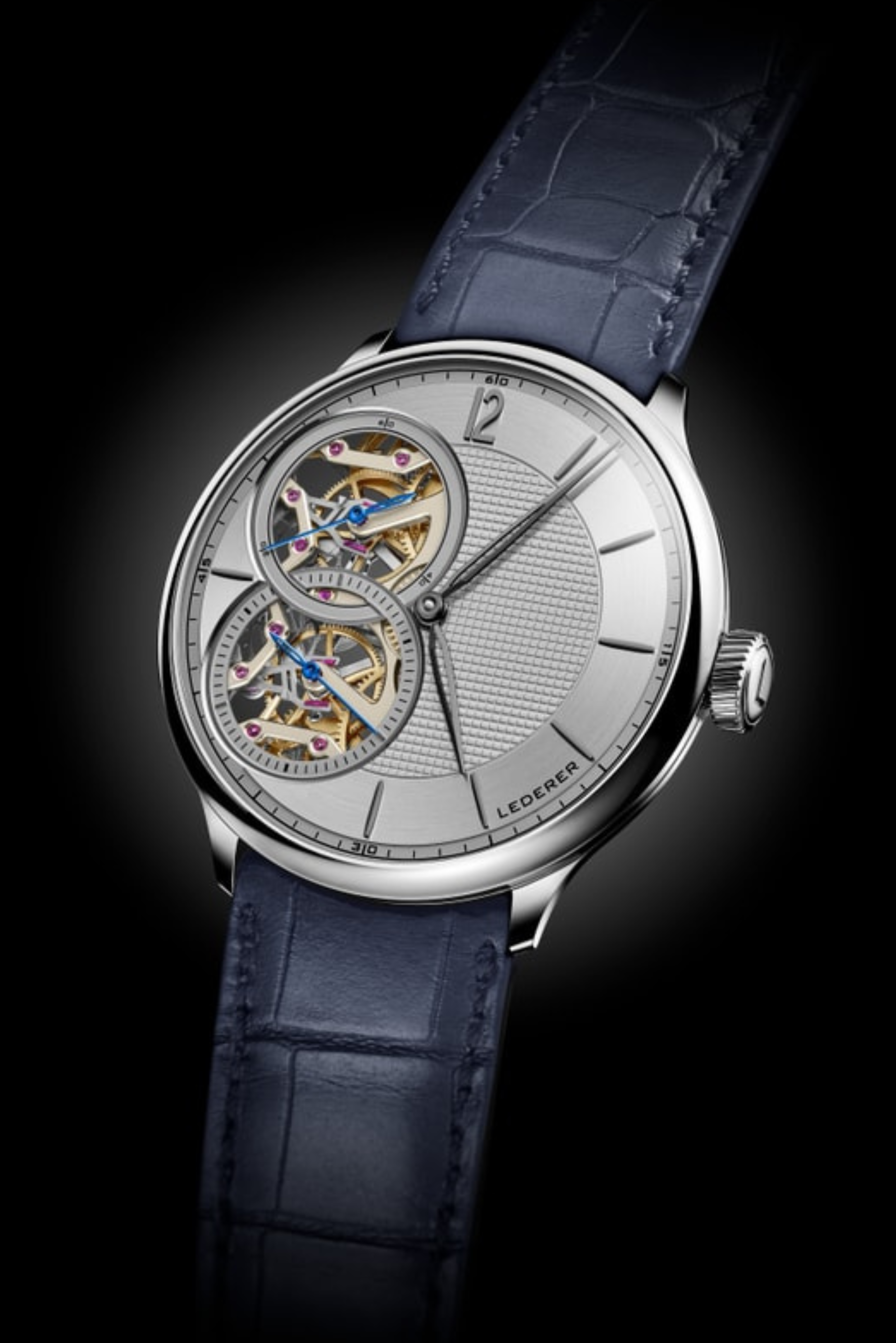 The surface itself is enhanced by a guilloché pattern exclusive to LEDERER, introducing a subtle play of light that reinforces both legibility and dimensionality. This refined texture creates a dialogue between traditional handcraft and contemporary mechanical thought.