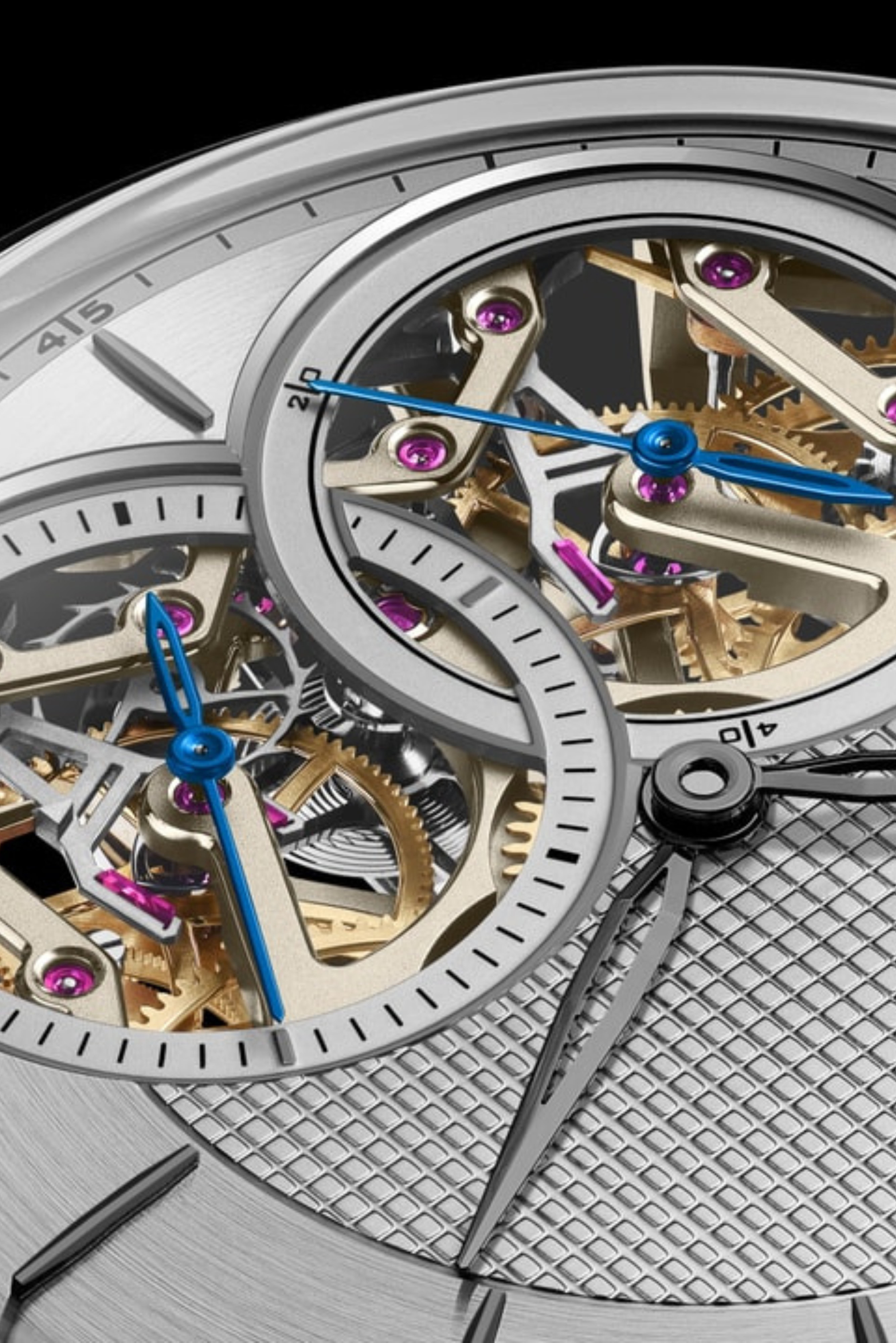 Its design is defined by two precisely executed apertures positioned between 6 and 12 o’clock, offering a controlled view into the dynamic heart of the movement. These openings are not decorative, but structural, allowing the rhythm of the escapement and the transmission of energy to become part of the dial’s visual language.